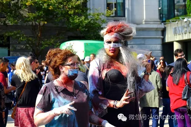 一年一度的“丧尸游行(Zombie Walk Vancouver )”昨天下午在温市中心举行,近千只经过悉心打扮,血淋淋、烂面、断手,破肚的“丧尸”步履蹒跚沿着Robson街、Denman街、一直到英吉列湾,沿途吸引近万民众观看。小编只想说:老外真会玩儿!