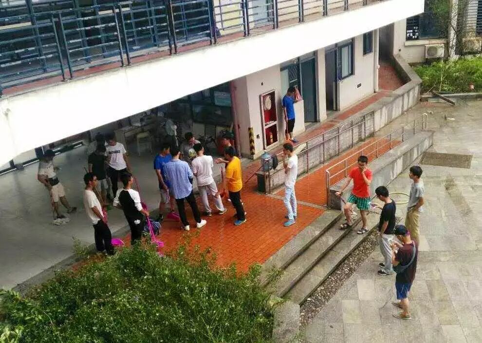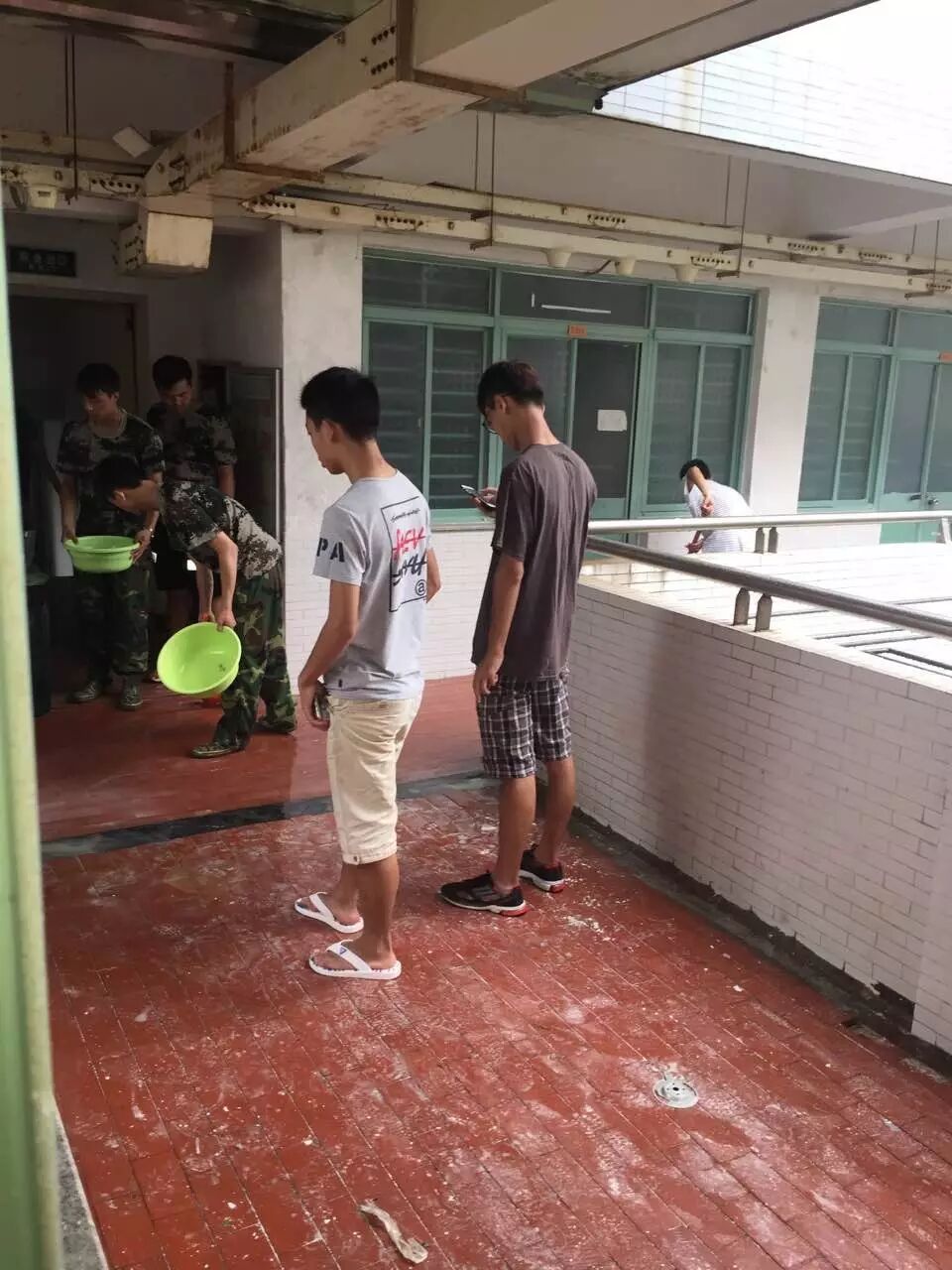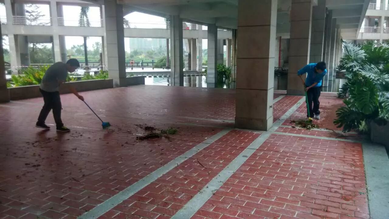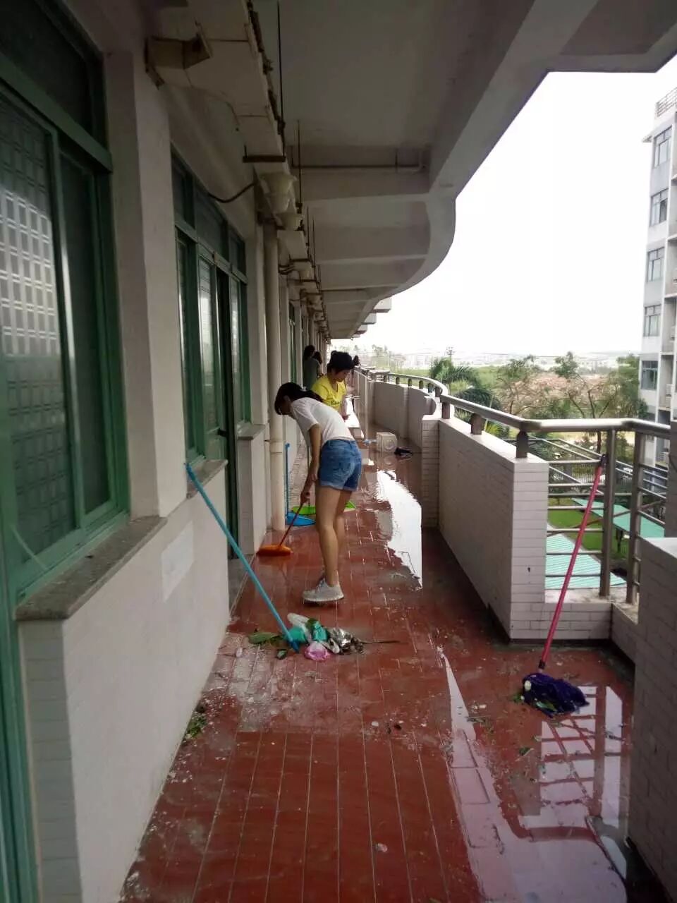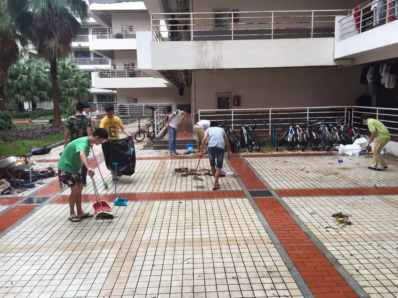 ▼正在清理教学区、宿舍楼的工作人员和志愿者们