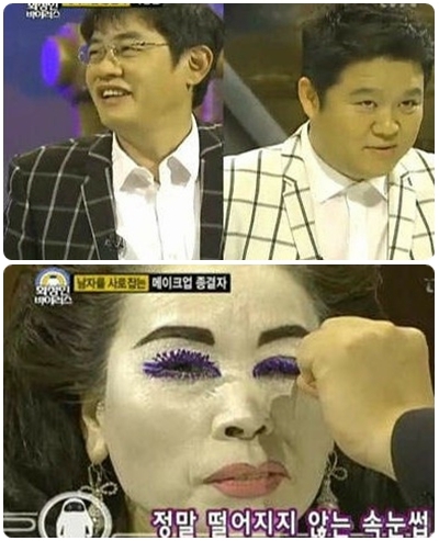 主持人全程不敢正视金阿姨的眼睛,着实被吓到了。终于有勇气伸手去摸睫毛,确认真的是阿姨的睫毛。