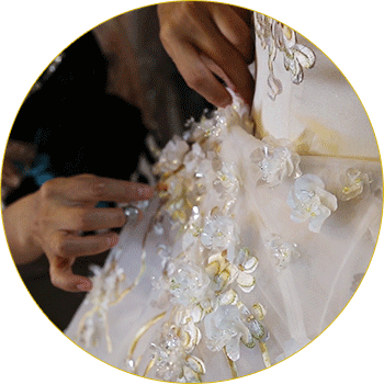 西式的裙摆与中式桂花与茉莉花瓣的渐变相搭配,整条礼裙中集合了东西方的两种智慧。