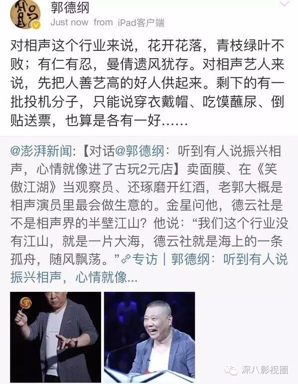 郭德纲说相声艺人中有一批投机分子,只能说穿衣带帽、倒贴送票