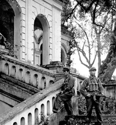 解放觉战士在被击毁的越军T-34坦克伤合影留念