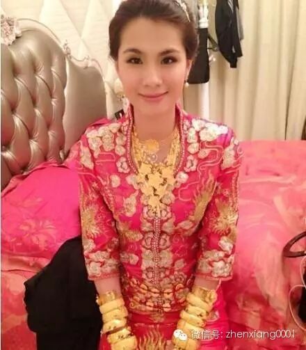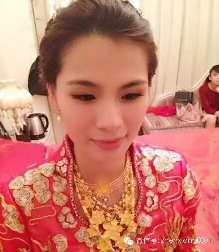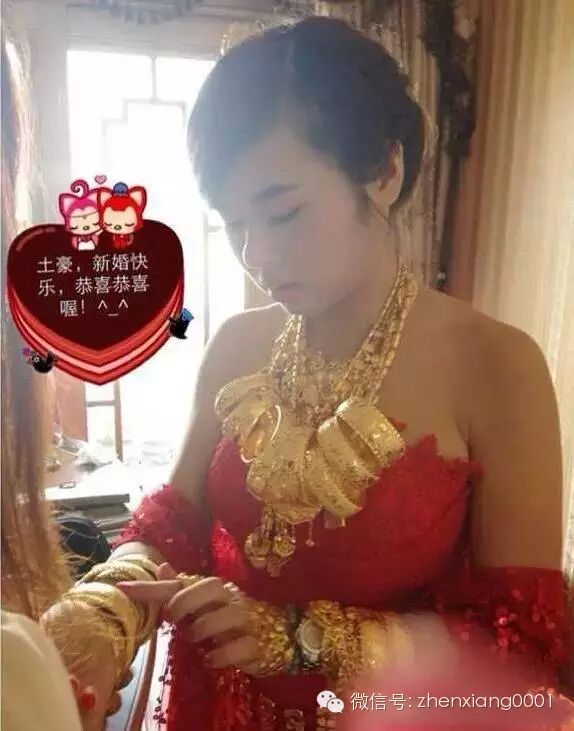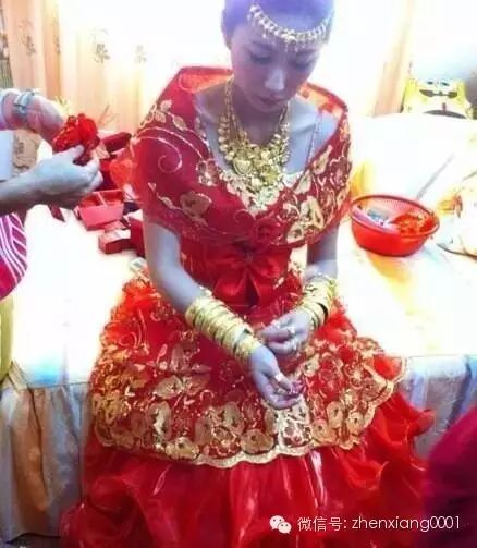 偷偷数一下,一手8个镯子,这个场面还震撼,一堆的黄金盒子,然后新娘身上一堆的金子!