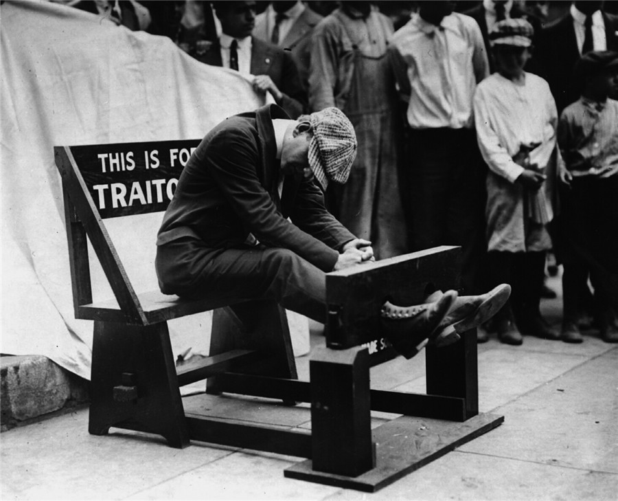 5.公然的羞辱。1916年,一名公开拒服兵役者被强令坐进特别制造的架子里。架子上印着标语“卖国贼的下场”。英国首次开始施行强制征兵。