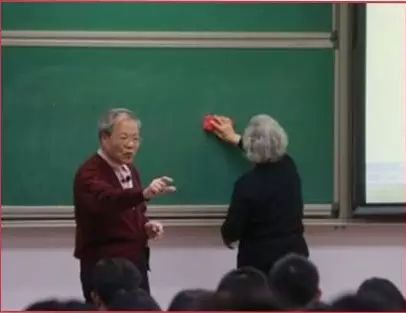 老教授站在讲台上,老奶奶静静坐在一旁,根据讲授内容,不时展示课件。老教授是中科院教授吴乃虎,妻子是北大细胞遗传学教授黄美娟。1994年后,吴乃虎身体不太好,黄美娟坚持为他擦黑板。