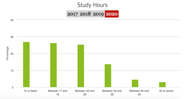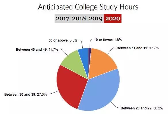 本次调查结果显示,2020届新生中,高中时期每周学习时长超过50小时及以上的仅为3.1%,相较2019届仅有0.1%的涨幅;平均保持在10至30小时的占多数,看到这样的数字对比,必须感慨一句,果然学霸们都是在冥想时顺带学习的。