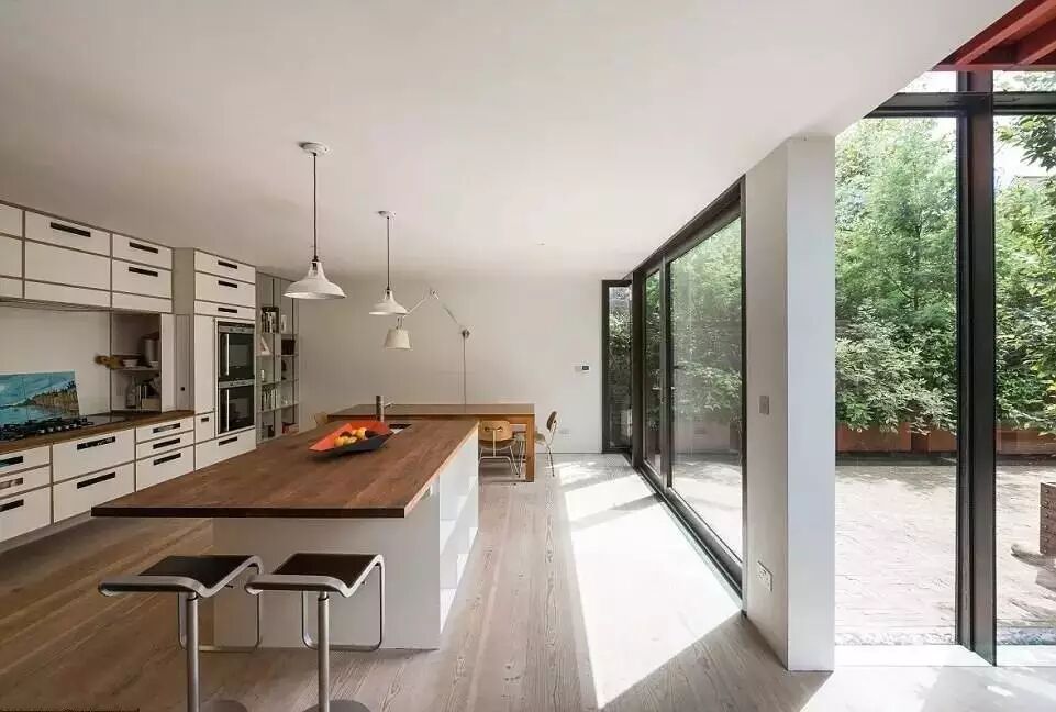 木面大岛台,低垂灯具,